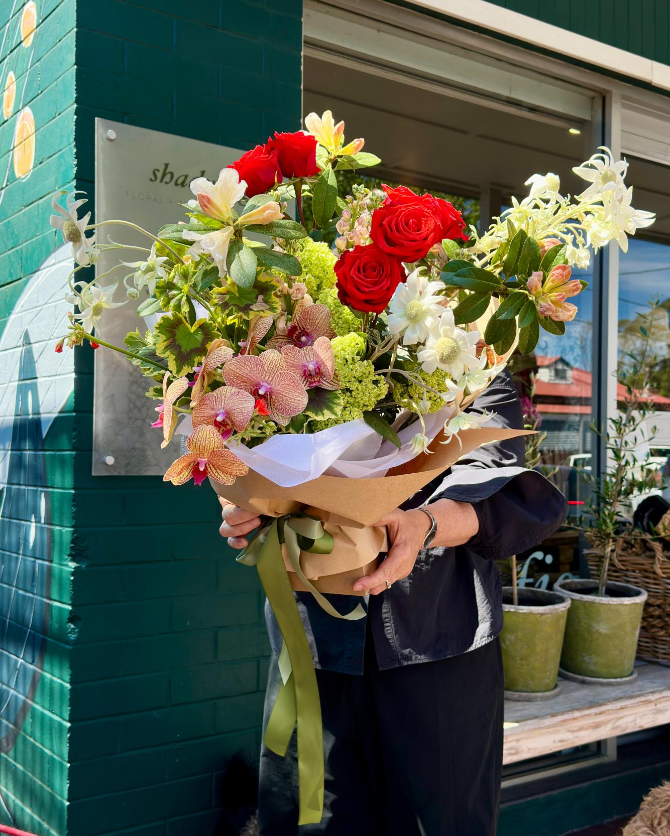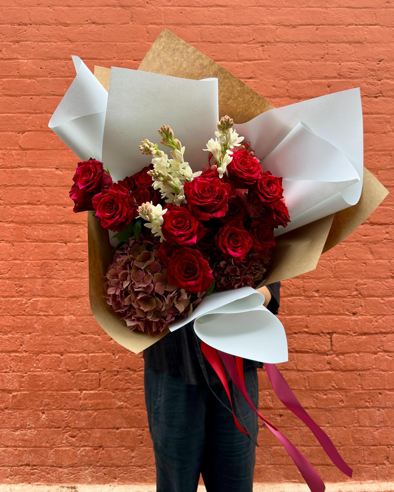 • SEASONAL VALENTINE’S BOUQUET –  A mixed arrangement of beautiful blousy roses and seasonal romantic flowers.